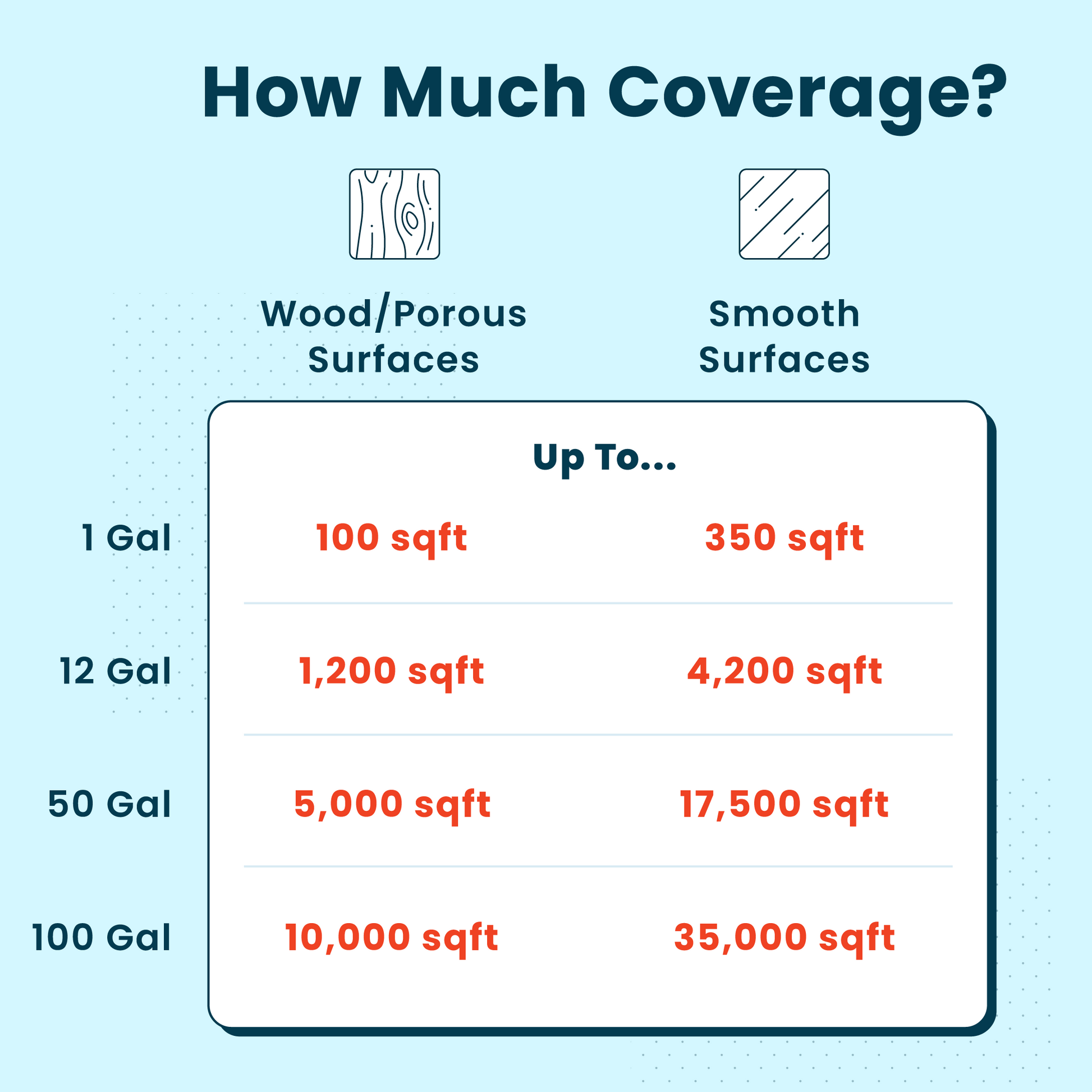 A: While every jobs varies in complexity, level of staining, and surface type, our customers report that 1 gallon can cover 250-350 sq. ft. of wood in a crawl space, and much more for smoother surfaces like painted brick, tile, drywall, and siding.