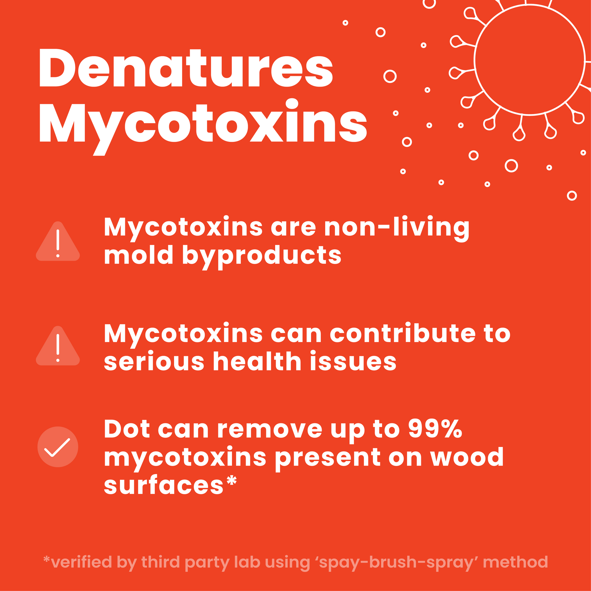 Boosted by Dot's Activator™, Extra Strength Mold Stain Remover can eliminate mycotoxins from the surfaces they are clinging to. Third-party testing has shown that Dot can remove up to 99% of mycotoxins that come from common mold varieties, using the spray-brush-spray method.