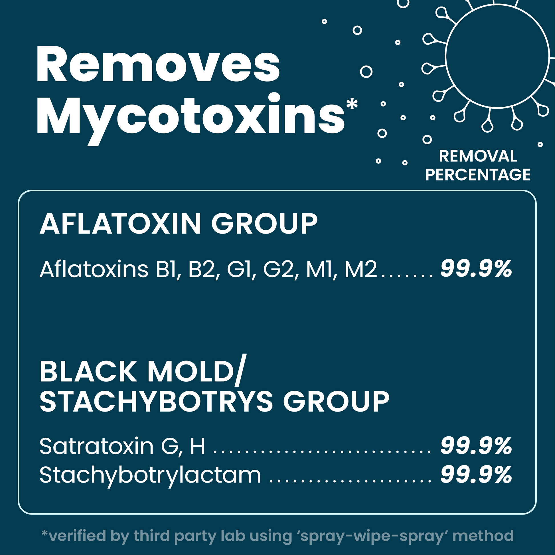 Boosted by Dot's Activatorâ„¢, Surface Cleaner eliminates mycotoxins from the surfaces they are clinging to. Third-party testing has shown that Dot can remove 99.9% of mycotoxins that come from common mold varieties using the spray-wipe-spray method. (See chart)